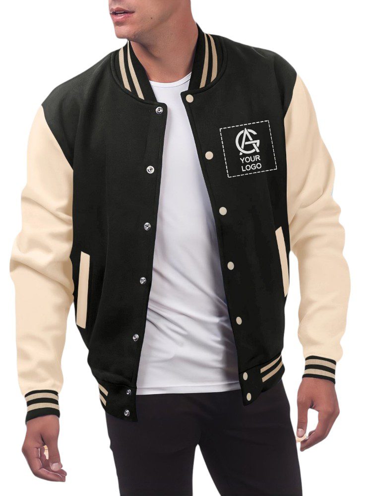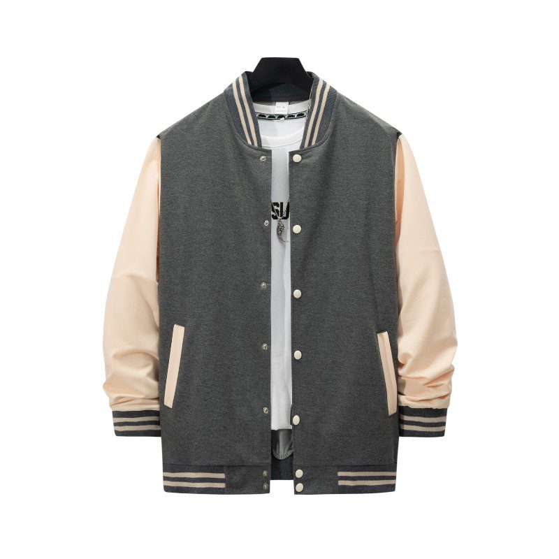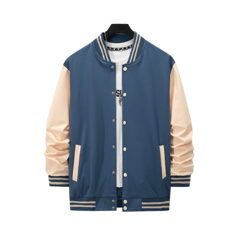 A stylish men’s varsity jacket designed in a classic baseball silhouette. Featuring a soft-touch body fabric paired with contrasting sleeves, this jacket delivers both comfort and standout style. The ribbed collar, cuffs, and hem add a clean athletic look, while the snap-button closure ensures quick and easy wear. Perfect for layering in spring, autumn, and mild winter weather.